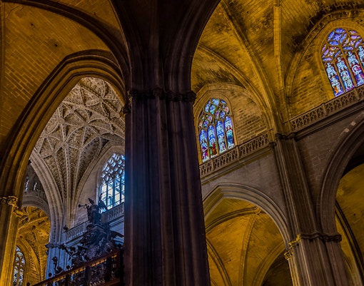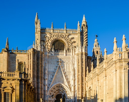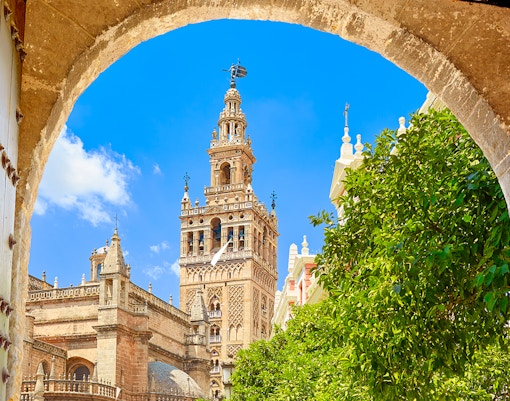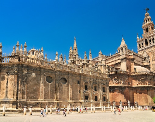 Die Stätte war ursprünglich eine große Almohaden-Moschee, die zwischen 1172-1198 erbaut wurde und deren Minarett und Innenhof den Umbau nach 1248 überlebte. Aus dieser Moschee ging die Geschichte der Kathedrale von Sevilla hervor, insbesondere der Patio de Naranjos und La Giralda.
