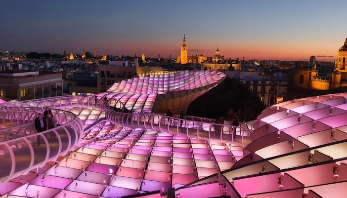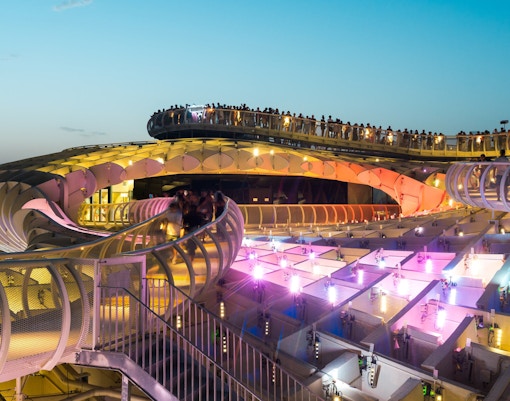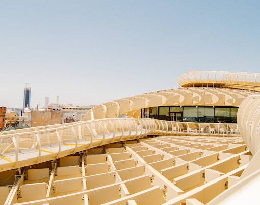 The centrepiece of any visit. At 27 metres high, a 250-metre timber path curves through all six mushroom canopies in a single looping route, with unobstructed views of the Giralda, Triana, the Guadalquivir, and the old city rooftops. Come late afternoon for the best light, or return in the evening to catch the sun setting over Triana from the western curve.